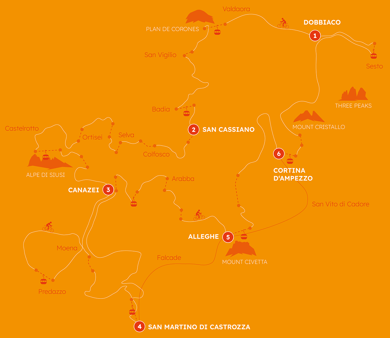 RODA, from the Latin “ruota” is the symbol of an unforgettable adventure in the Dolomites. RODA is the best way to experience the Dolomites in a new way: without stress, without a stopwatch. Just you, your bike and the incredible beauty of the mountains. A week full of fun, ease and freedom.
